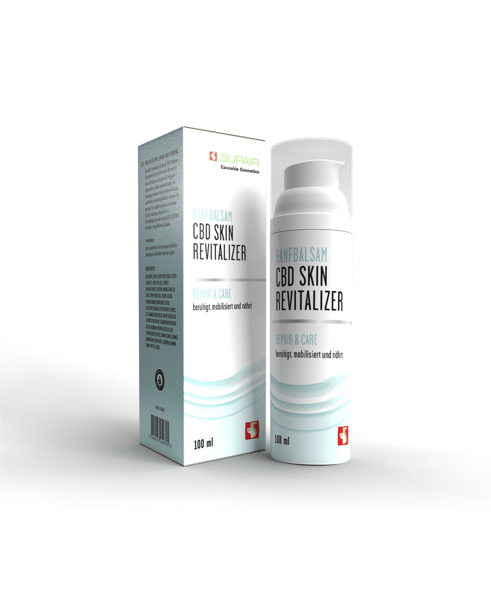 Verwöhnen Sie Ihre Haut mit der intensiven Pflege des Hanfbalsam CBD Skin Revitalisers. Die kostbaren Öle aus Sesam, Sonnenblumen, Macadamianüssen und Oliven bewahren die Feuchtigkeit der Haut und verleihen ihr ein geschmeidiges Gefühl. Bereits beim Einmassieren spüren Sie die wohltuende Wirkung der CBD Skin Cream auf Muskeln und Gelenke. Jeder Dispenser enthält 100 ml CBD Skin Cream.